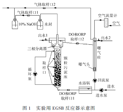進(jìn)水和回流水分別采用蠕動(dòng)泵加壓,兩者合流進(jìn)入EGSB 反應(yīng)器?;亓魉占狡貧庵鶅?nèi),通過(guò)給曝氣柱內(nèi)回流水曝氣的方式來(lái)給顆粒污泥床供氧,并通過(guò)控制曝氣柱內(nèi)曝氣量來(lái)控制EGSB 反應(yīng)器內(nèi)溶解氧量。對(duì)進(jìn)出水氧化還原電位(ORP)進(jìn)行監(jiān)測(cè)以調(diào)節(jié)曝氣量,進(jìn)而控制EGSB 反應(yīng)器內(nèi)的氧化還原狀態(tài)。
