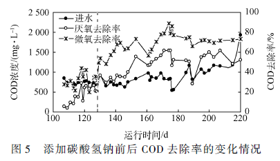 查閱大量文獻(xiàn)資料,分析表明此時(shí)的微氧顆粒污泥菌群中降解這些毒性污染物質(zhì)的菌群不存在或者說(shuō)他們的活性不夠強(qiáng),可能是他們有特殊的營(yíng)養(yǎng)需求,其中無(wú)機(jī)碳營(yíng)養(yǎng)是需要重點(diǎn)考慮的(各種污染物質(zhì)降解菌之間會(huì)競(jìng)爭(zhēng)無(wú)機(jī)碳源)。接下來(lái)給反應(yīng)器中添加無(wú)機(jī)碳營(yíng)養(yǎng)物———碳酸氫鈉(說(shuō)明:不是為了調(diào)節(jié)pH,事實(shí)上添加碳酸氫鈉后反應(yīng)器內(nèi)pH也沒(méi)有出現(xiàn)明顯變化),分析COD 去除率的變化情況,具體見(jiàn)圖5。