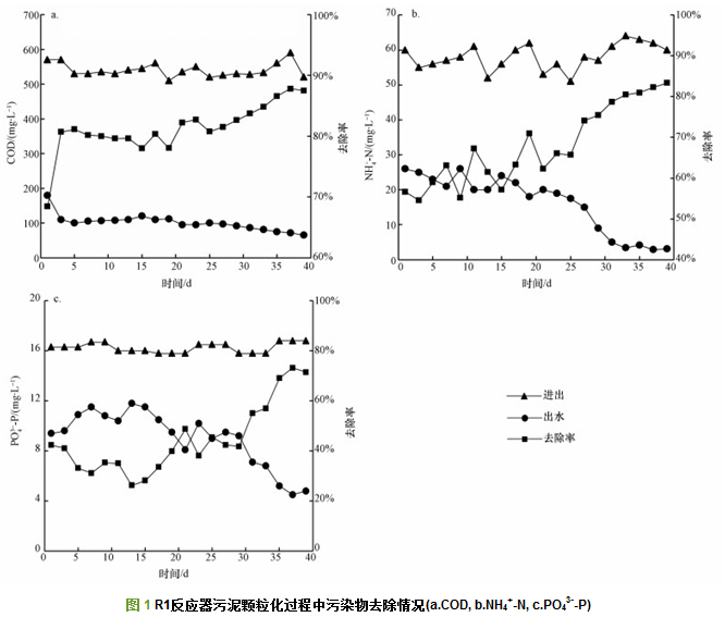 R1為實(shí)驗(yàn)室人工配水培養(yǎng),經(jīng)大量文獻(xiàn)查閱確定的進(jìn)水COD、C/N比和C/P比均有利于好氧顆粒污泥的形成,水質(zhì)接近雨污分流后城鎮(zhèn)生活污水.污水污染物:COD 600 mg·L-1,NH4+-N 60 mg·L-1,PO43--P 16 mg·L-1.配水組分:NaAc 8560 mg·L-1,NH4Cl 2240 mg·L-1,MgSO4·7H2O 1804 mg·L-1,K2HPO4 735 mg·L-1,KCl 350 mg·L-1,KH2PO4 288 mg·L-1.