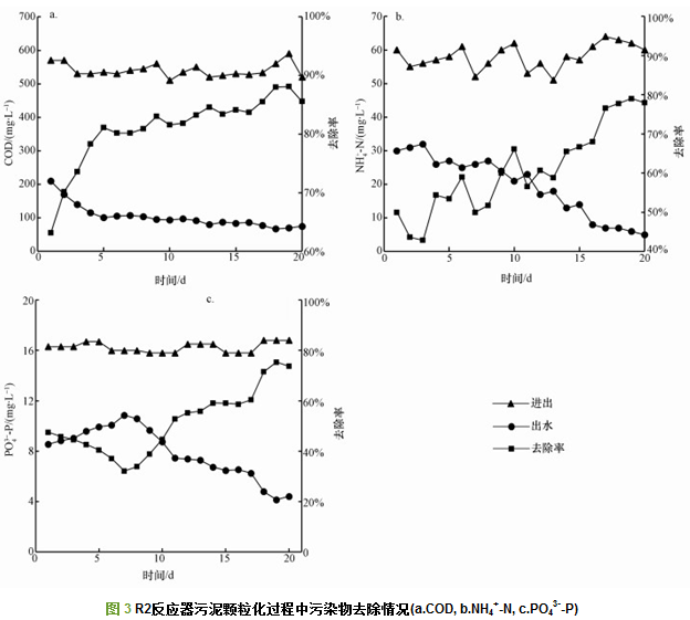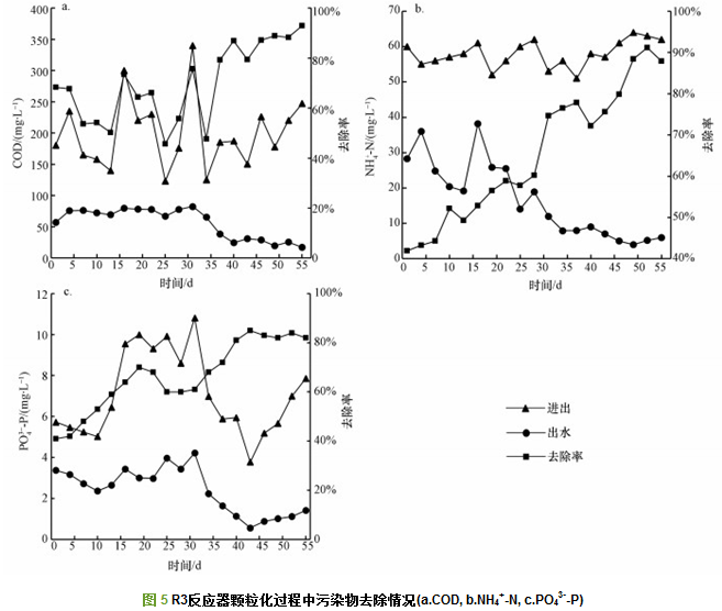 R3為模擬分散型農(nóng)村污水,各污染物含量為:COD 130~320 mg·L-1,NH4+-N 50~65 mg·L-1,PO43--P 3~14 mg·L-1.