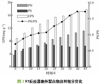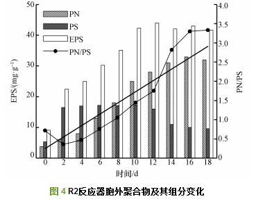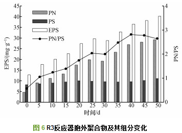 2) EPS在顆?;^程中增加明顯,R1、R2和R3的增量分別到達(dá)10、30和30 mg·g-1(以MLSS計(jì)),蛋白質(zhì)在EPS增量中占主要比例,是顆?;M(jìn)程的重要因素.多糖含量變化較小,PN/PS比值從0.7分別增加到1.7、3.3和2.6,形成的顆粒污泥的穩(wěn)定性較高.。