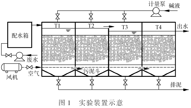 實驗裝置如圖1 所示,其主體為4 級生物膜反應(yīng)器,由T1、T2、T3、T4 等4 個好氧反應(yīng)單元串聯(lián)而成,有效容積分別為1. 71、1. 71、1. 64 和1. 61 m3 ,廢水在反應(yīng)器中呈折流狀態(tài)逐級流動。各單元均設(shè)有填充率為70% 的親水性網(wǎng)狀交聯(lián)大孔載體、微孔曝氣裝置及穿孔排泥管,載體為自制3 cm × 3 cm × 3cm 立方體,孔隙率96. 7% 、持水倍率31. 2、比表面積3. 8 × 105 m2 ·m - 3 、孔徑范圍為2. 5 ~ 5 mm,處理過程中呈懸浮狀態(tài)。載體上脫落的生物膜可沉積至污泥斗,通過穿孔排泥管定期排出反應(yīng)器。反應(yīng)器外部設(shè)有風(fēng)機(jī)、進(jìn)水調(diào)節(jié)系統(tǒng)及堿液補充系統(tǒng)。處理過程中通過回轉(zhuǎn)式風(fēng)機(jī)持續(xù)供氣,供氣量根據(jù)在線DO 儀讀數(shù)和PLC 控制系統(tǒng)調(diào)整風(fēng)機(jī)頻率,與在線pH 計聯(lián)鎖的堿液補充系統(tǒng)可根據(jù)pH 變化向需要補充堿度的單元及時投加氫氧化鈉溶液,進(jìn)水調(diào)節(jié)系統(tǒng)中可根據(jù)實驗需要調(diào)整進(jìn)水污染物負(fù)荷。