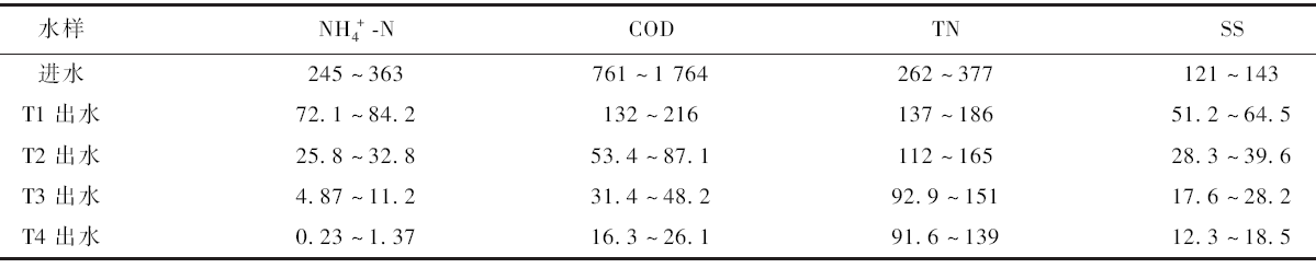 實驗由啟動、穩(wěn)定運行及關(guān)鍵參數(shù)分析3 個階段組成。啟動階段的前3 d 進(jìn)行悶曝,將廢水引入反應(yīng)器使各單元水位達(dá)到設(shè)計要求,開啟回轉(zhuǎn)式風(fēng)機(jī)進(jìn)行曝氣,每天向各單元投加由枯草芽胞桿菌、產(chǎn)堿桿菌、亞硝化單胞菌、銅綠假單胞菌組成的復(fù)合微生物菌劑1 次,投加量依次為60、40 和20 g。養(yǎng)生3 d 后開始以0. 12 m3 ·h - 1 的流量連續(xù)進(jìn)水、連續(xù)曝氣并維持各單元ρ(DO) = 3 ~ 5 mg·L - 1 ,期間向需要補堿的單元投加氫氧化鈉溶液并保證反應(yīng)器出水pH > 7,每天定時檢測反應(yīng)器進(jìn)、出水NH +4 -N 及COD 變化。穩(wěn)定運行階段考察系統(tǒng)處理效果的穩(wěn)定性及反應(yīng)器沿程水質(zhì)變化特征,共運行21 d,期間HRT = 55. 6 h,ρ(DO) = 2. 1 ~ 3. 2 mg·L - 1 、水溫18. 7 ~ 24. 1 ℃ ,在T3 單元投加氫氧化鈉溶液。關(guān)鍵參數(shù)分析階段主要考察HRT、進(jìn)水NH +4 -N 負(fù)荷及進(jìn)水COD 負(fù)荷變化對處理效果的影響,通過調(diào)整進(jìn)水流量改變HRT,投加氯化銨溶液改變進(jìn)水NH +4 -N 濃度,投加甲醇改變進(jìn)水COD 濃度,操作過程中控制各單元ρ(DO) = 2. 5 ~3. 5 mg·L - 1 、水溫18. 7 ~ 24. 1 ℃ ,控制反應(yīng)器出水pH > 7。