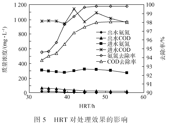 在進(jìn)水ρ ( NH +4 -N) = 275 ~ 320 mg · L - 1 、ρ(COD) = 944 ~ 1 391 mg·L - 1 的條件下,HRT 變化對處理效果的影響如圖5 所示。