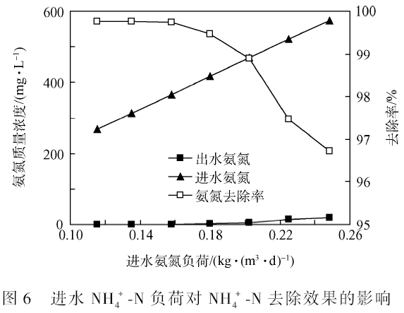 受煤氣化生產(chǎn)線不穩(wěn)定因素的影響,生物處理單元進(jìn)水水質(zhì)波動較大,這就要求反應(yīng)器對進(jìn)水負(fù)荷變化具備一定的緩沖能力,因而需要考察進(jìn)水負(fù)荷對反應(yīng)器處理效果的影響。在HRT = 55. 6 h,進(jìn)水ρ(COD) = 983 ~ 1 347 mg·L - 1 的條件下,進(jìn)水NH +4 -N 負(fù)荷對NH +4 -N 去除效果的影響如圖6 所示。