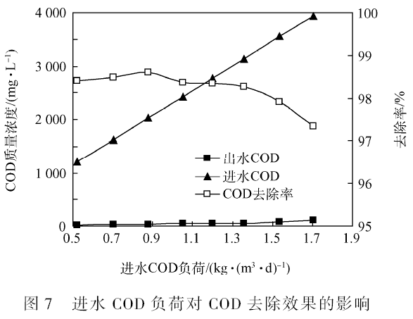在HRT = 55. 6 h, 進(jìn)水ρ ( NH +4 -N) = 273 ~313 mg·L -1 的條件下,進(jìn)水COD 負(fù)荷對COD 去除效果的影響如圖7 所示。隨著進(jìn)水COD 負(fù)荷的提高,出水ρ ( COD) 逐漸增大, 在進(jìn)水COD 負(fù)荷≤1. 357 kg·(m3 ·d) - 1 的情況下,出水ρ(COD)≤54. 2 mg·L - 1 ,可達(dá)到《石油化學(xué)工業(yè)污染物排放標(biāo)準(zhǔn)》(GB 31571-2015)水污染物排放限值要求。COD 去除率在進(jìn)水COD 負(fù)荷≥1. 198 kg·(m3 ·d) - 1 后呈持續(xù)下降趨勢,當(dāng)進(jìn)水COD 負(fù)荷= 1. 703 kg·(m3 ·d) - 1 ,COD 去除率降至97. 3% 。
