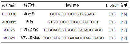 本研究采用4種寡核苷酸熒光探針對厭氧顆粒污泥中特定的微生物種群進(jìn)行定量分析, 探針信息見表 1.樣品的預(yù)處理則參考了文獻(xiàn)[14, 15]的方法.